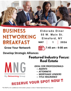Are you in the Real Estate Industry? Are you looking to grow your busiess? Develop strategic alliances? And meet interesting people? Then please join us for a Business Networking Breakfast Friday May 1, 2026 7:45 AM – 9:00 AM. Eldorado Diner, 55W. Mains St. Elmsford, NY.